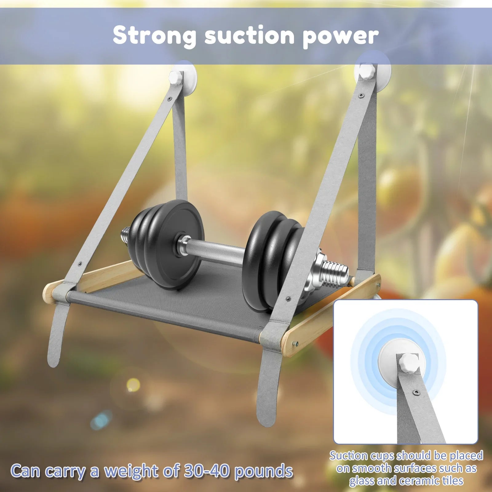 vis, tournevis, sangles, planches en bois, ventouses et tissu.